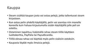 • Steam sisältääkaupan josta voi ostaa pelejä, jotka tallentuvat steam