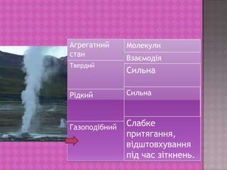 Тип взаимодействийБинарныеКак правилодвухчастичныестолкновения,трёхчастичные крайне редки.КоллективныеКаждая частица взаимодействует сразу со многими. Эти коллективные взаимодействия имеют гораздо большее влияние чем двухчастичные. Агрегатні стани в побуті!