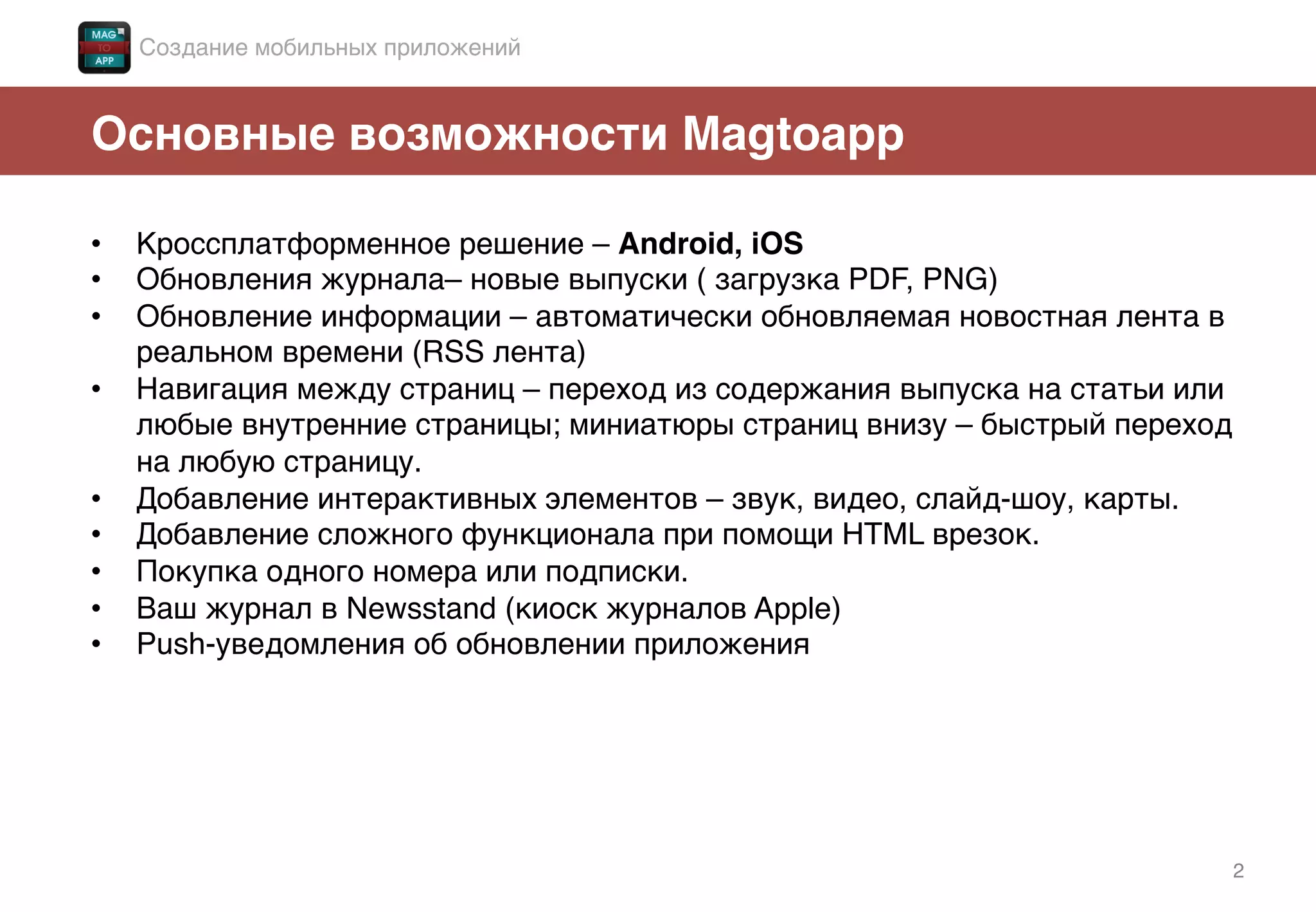 Документ описывает создание мобильного приложения с использованием платформы magtoapp, включая основные функции, такие как кроссплатформенная совместимость, интерактивные элементы и различные типы контента. В нем также подробно рассматриваются инструменты для импорта материалов и настройки внешнего вида приложения, таких как видео, аудио, слайд-шоу и карты. Кроме того, предоставлены инструкции по коммуникации и поддержке пользователей через контактную информацию.