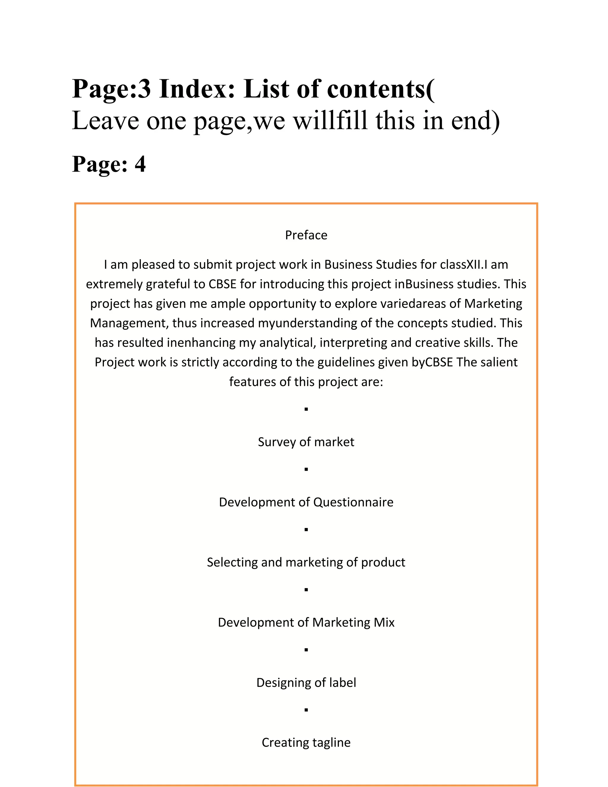 This 3-page document provides guidelines and instructions for a class 12 business studies project on marketing management. It outlines the required sections and content for the project, including an introduction, survey of the market, product details, marketing mix strategies, packaging, distribution channels, promotion plans, pricing analysis, and conclusions. The project aims to enhance students' understanding of key marketing concepts and develop their analytical, creative, and presentation skills.
