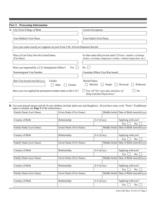 This document is an application for permanent residence or adjustment of status (Form I-485). It collects biographic information about the applicant such as name, address, date and place of birth, citizenship, and immigration status history. It asks about the basis for eligibility for permanent residence such as an approved immigrant visa petition, asylum status, or continuous residence since 1972. It also collects information about the applicant's family members, membership in organizations, and criminal history. If approved, this application would grant the foreign national lawful permanent resident status in the United States.