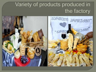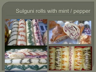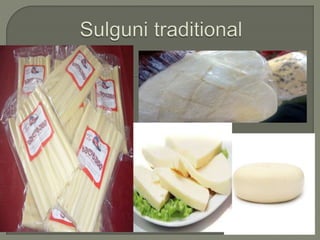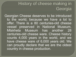 Georgian cheese deserves global introduction as evidence shows cheese production has existed in Georgia for over 6,000 years, far longer than the 4,000 years of known cheese history worldwide. Two museums in Georgia contain cheese vessels that are over 8,000 and 2,800 years old respectively, demonstrating Georgia's claim as the oldest country for cheese production. The document promotes smoked sulguni, a traditional Georgian cheese that can be flavored with herbs like thyme, tarragon, and mint or spices such as saffron and barberries, and is also available with additions like ham.