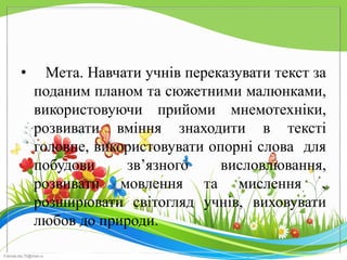 • Мета. Навчати учнів переказувати текст за