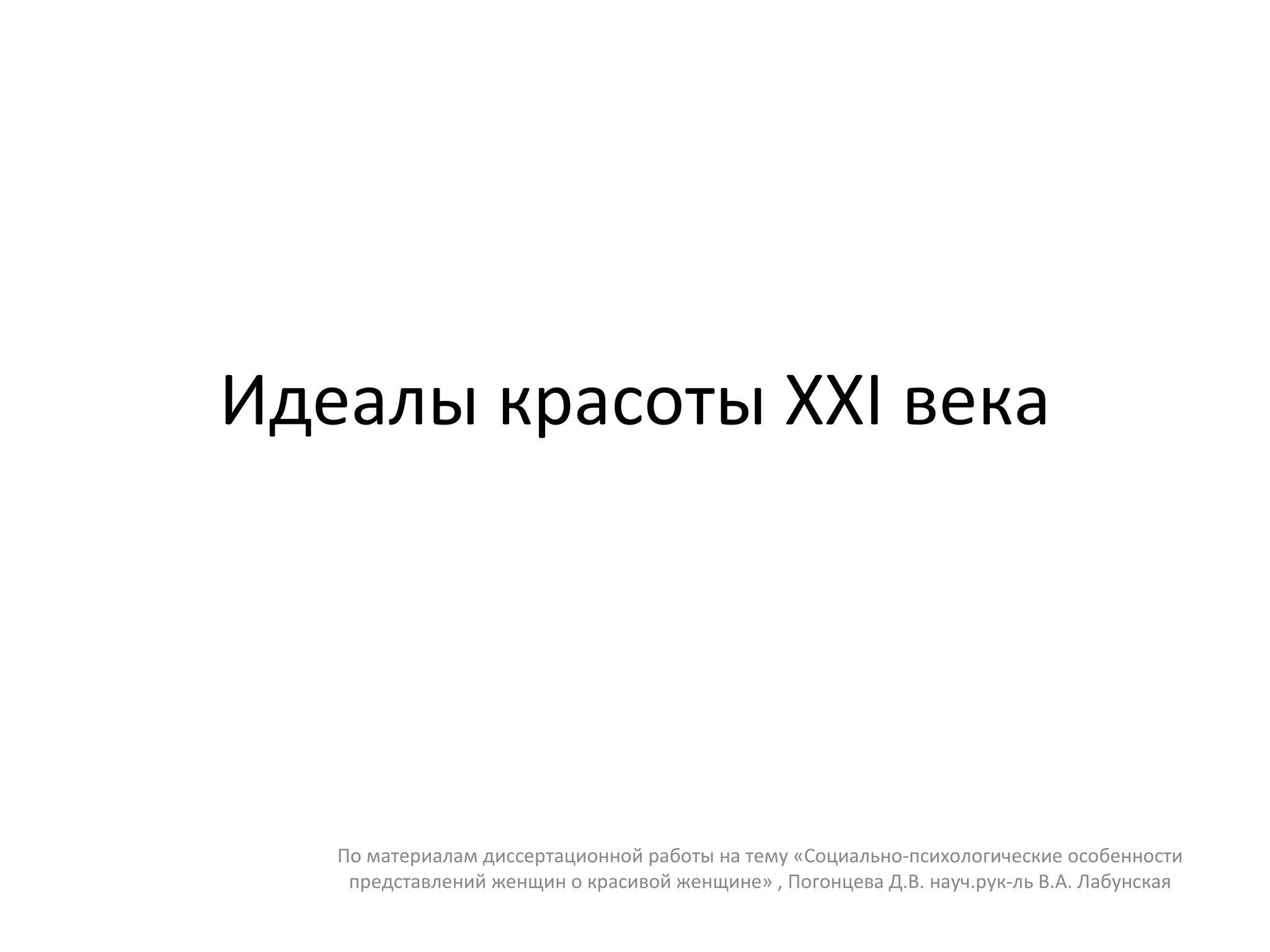В диссертационной работе рассматриваются социально-психологические особенности представлений женщин о красивой женщине на основе опроса 170 женщин различных возрастов и профессий. Среди популярных идеалов красоты выделяются известные актрисы и певицы, такие как Анджелина Джоли, Пенелопа Круз и Мэрилин Монро. Результаты показывают разнообразие мнений о стандартах красоты в современном обществе.