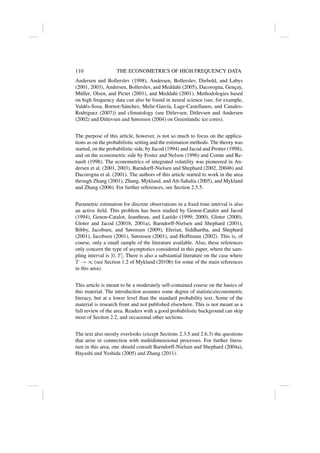Chapter 2 focuses on the econometrics of high frequency data, aimed at those interested in finance, statistics, and econometrics. It introduces the probabilistic models for high frequency data and emphasizes estimating volatility, applicable to various financial analysis methods. The document discusses methodologies for estimation, variations in literature, and the implications for risk management and financial forecasting.