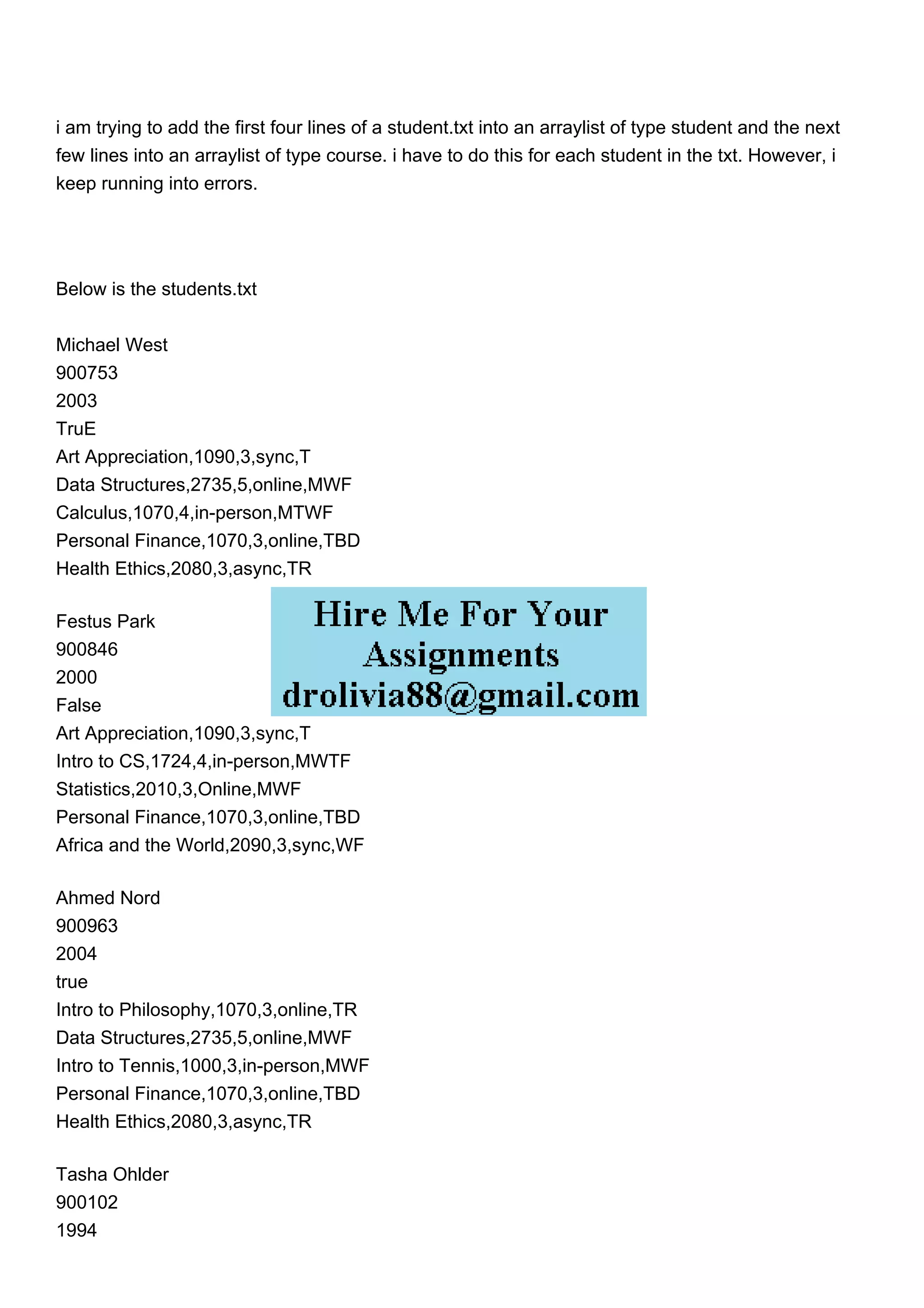 The document discusses a coding issue where the author is attempting to read student and course data from a text file into two ArrayLists but encounters errors in processing the data. The primary focus is on the Java code provided for reading the file, creating Student and Course objects, and handling exceptions related to input mismatches. The author requests help to fix the errors occurring during code execution.
