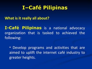 I-Café Pilipinas is a national advocacy organization that aims to develop the internet café industry. It represents internet café owners and operators across the country. Its goals are to develop programs that uplift the industry, form partnerships between café operators and ICT stakeholders, and develop a vision for internet cafés in the next decade. It is working to link café owners through summits and regional events in 2010 to advance its advocacy efforts.
