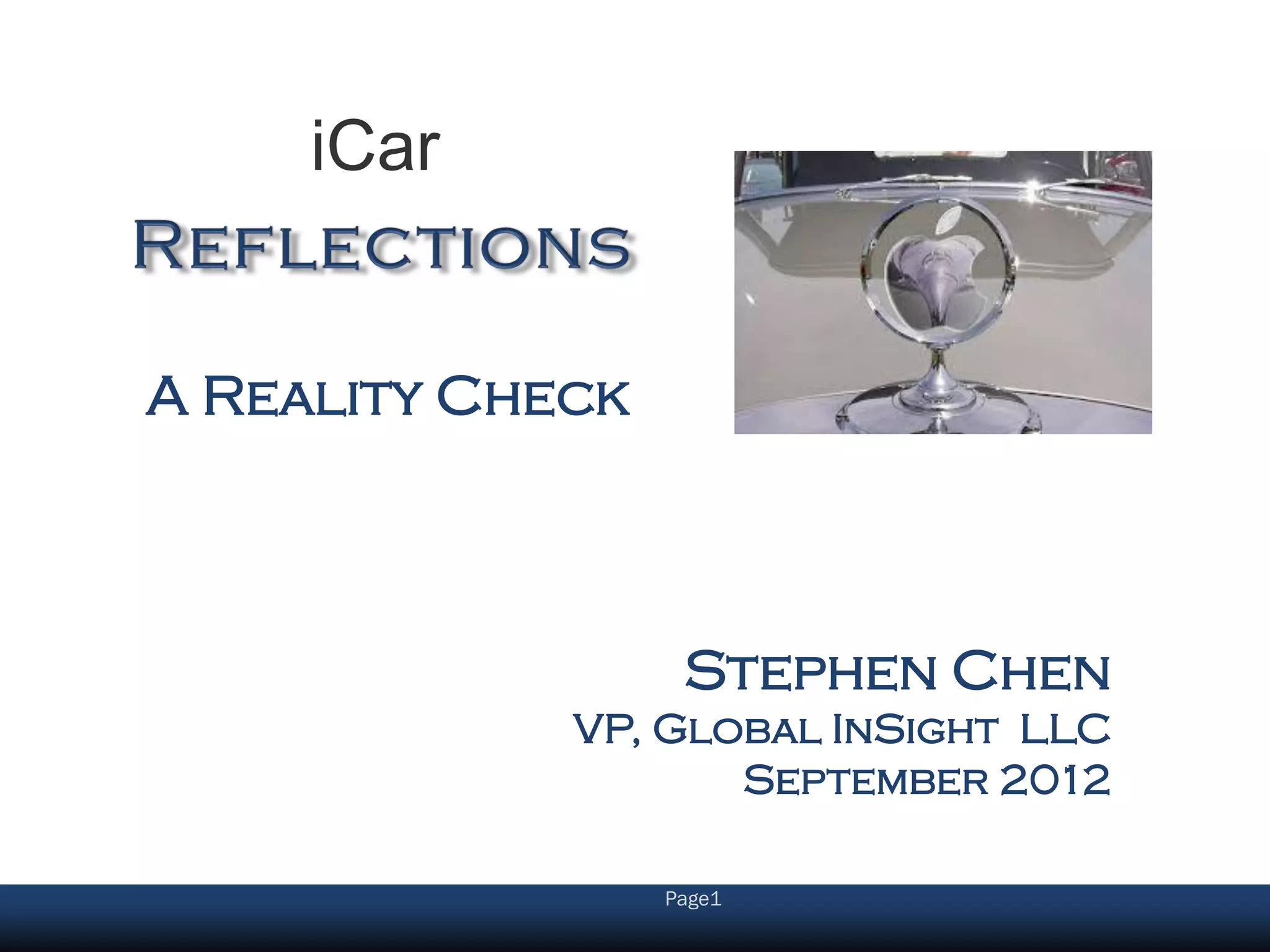 The document discusses the challenges of designing an "iCar" modeled after Apple's brand and approach. It would need to meet Apple's standards for ease of use, integration, and safety while addressing the immense technical challenges of automotive engineering. These include integrating over 100 microprocessors and sensors, meeting various regulatory standards, and developing autonomous driving capabilities. Networking multiple vehicle systems reliably and keeping costs affordable for buyers would also be difficult hurdles to overcome.