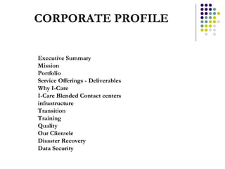 I-Care International Group of Consultancy provides a variety of business process outsourcing and IT-enabled services. They aim to be a one-stop solution for outsourced services including contact centers, IT services, and data management. I-Care has experienced teams and rapid implementation capabilities. They offer services such as customer care, data entry, and remote support. I-Care is committed to quality, security, and disaster recovery to ensure reliable services for their clients.