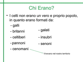 I Celti non erano un popolo unico, ma un insieme di diverse tribù come Galli e Britanni, che migrarono in Europa intorno al 390 a.C. e svilupparono una società rurale organizzata in classi sociali. La religione era guidata dai druidi e i culti includevano diversi dei importanti, mentre la vita quotidiana comprendeva agricoltura, artigianato e commercio. Oggi si possono trovare reperti celtici come dracme e falere nei musei, evidenziando la loro arte e cultura.