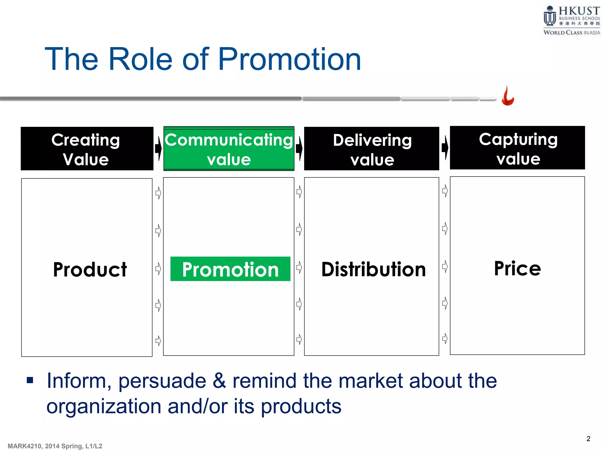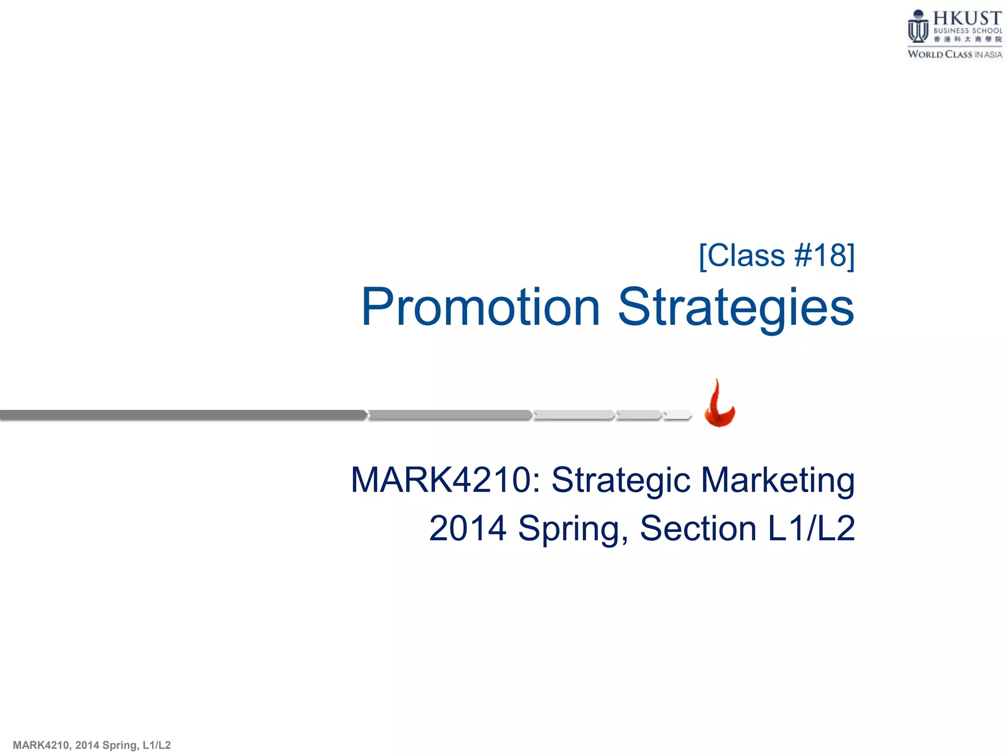 This document discusses various promotion strategies and elements. It covers the role of promotion in informing, persuading and reminding the market. The main promotional mix elements are described as personal selling, advertising, sales promotion, direct marketing and public relations. Considerations for choosing the right promotional element include the target market, product nature, product life cycle stage and budget. Both push and pull strategies are outlined. Methods for setting the promotional budget and measuring advertising effectiveness are also discussed.