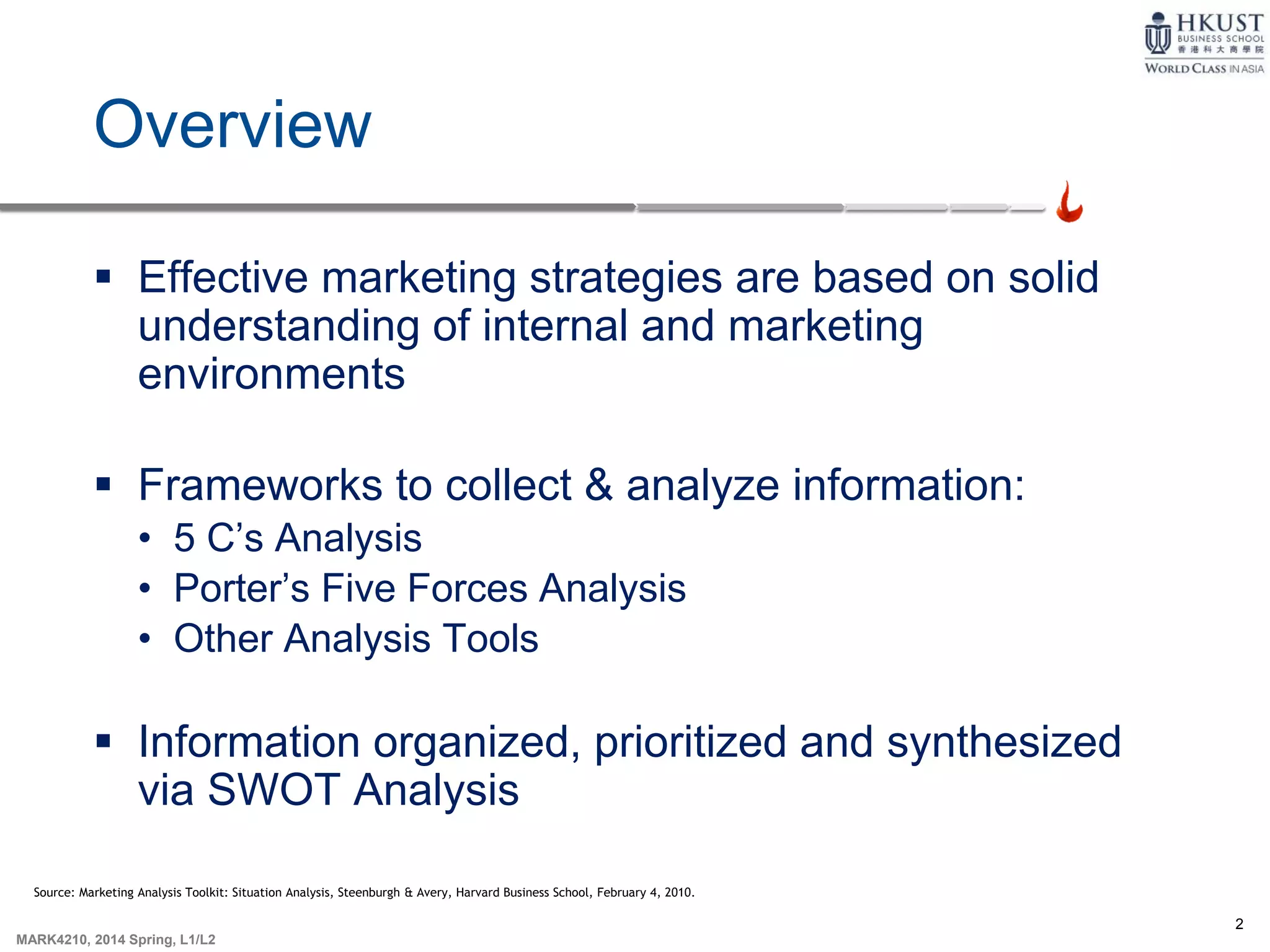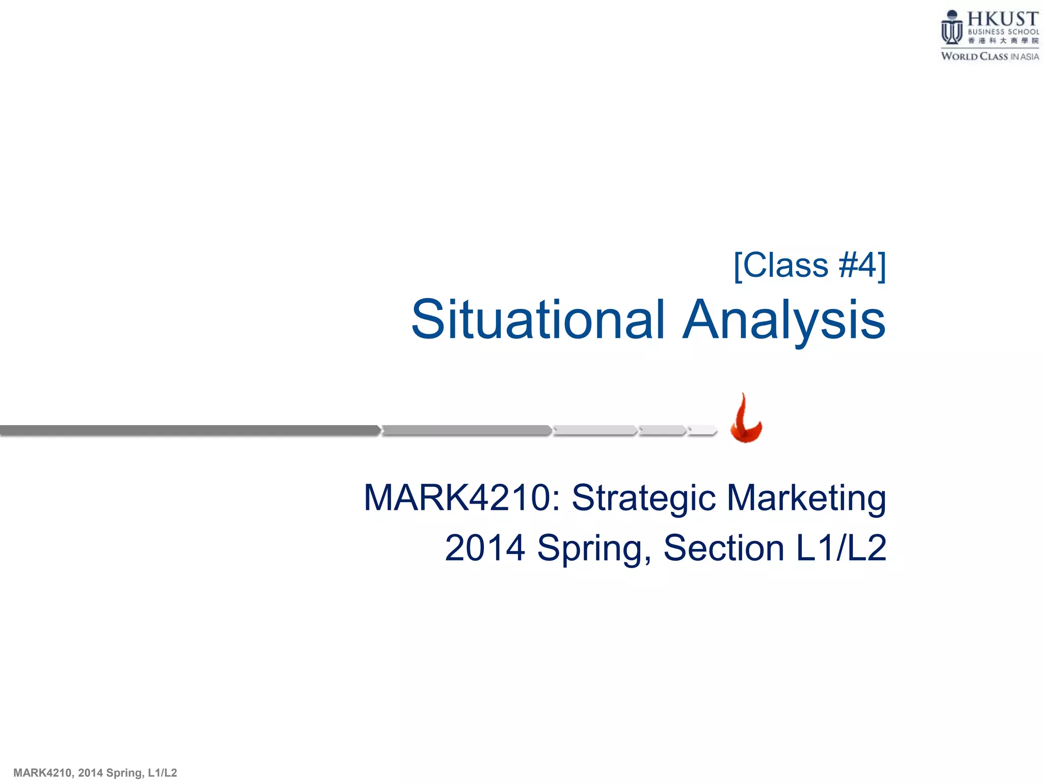 The document provides an overview of frameworks and tools for conducting a situational analysis as part of strategic marketing. It discusses the 5 C's analysis framework which allows managers to understand customers, the company, competitors, context, and collaborators/complementers. It also covers Porter's Five Forces analysis and other tools such as scenario planning, market structure analysis, and timeline cause-and-effect analysis. The situational analysis information is then organized and prioritized through a SWOT analysis to identify critical strategic factors.