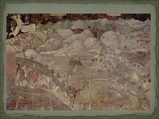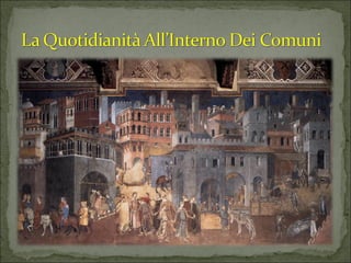Il documento descrive l'origine e l'evoluzione dei comuni nel basso medioevo, evidenziando il loro sviluppo a seguito del rifiorimento del commercio e dell'urbanizzazione. Viene delineato il movimento comunale, che ha portato alla creazione di nuove forme di governo, all'incontro tra i diversi ceti sociali e a conflitti tra fazioni, rappresentati visivamente nell'affresco di Lorenzetti. Inoltre, viene citato Faenza come esempio di comune storicamente significativo che ha mantenuto la sua identità fino ai giorni nostri.