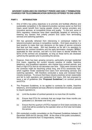 The document summarizes IDA's decisions on proposed guidelines regarding contract periods and early termination charges for telecommunication services offered to residential end users in Singapore.