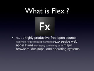 Flex is a highly productive, free and open source framework for building expressive web applications that can deploy consistently across major browsers, desktops, and operating systems. It uses a combination of ActionScript for programming and MXML for user interfaces. Flex applications provide rich user experiences with capabilities like multimedia playback, 3D graphics, video/voice chat, and camera support. Flex allows for rapid prototyping, low cost development and painless distribution for businesses and programmers.