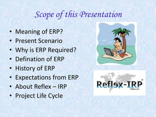 This document provides an overview of enterprise resource planning (ERP) solutions. It defines ERP as a solution that integrates a company's information systems across all functional areas to perform core activities and focus on customer satisfaction and service. The document then discusses the current scenario of isolated information systems, outlines why ERP is needed to improve management and reduce costs, and provides a brief history of ERP systems. It also summarizes the expectations of ERP, describes Reflex IRP as a generalized off-the-shelf application, and outlines the typical project life cycle for an ERP implementation project.