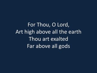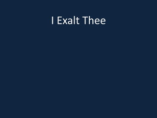 This document is a song that exalts and lifts up the name of Jesus Christ. It declares that God is high above all things on earth and is exalted far above all other gods. The song encourages both "I" and "We" to exalt the Lord with all that we have and all that we are, and that the purpose of the song is to lift up and celebrate Jesus.