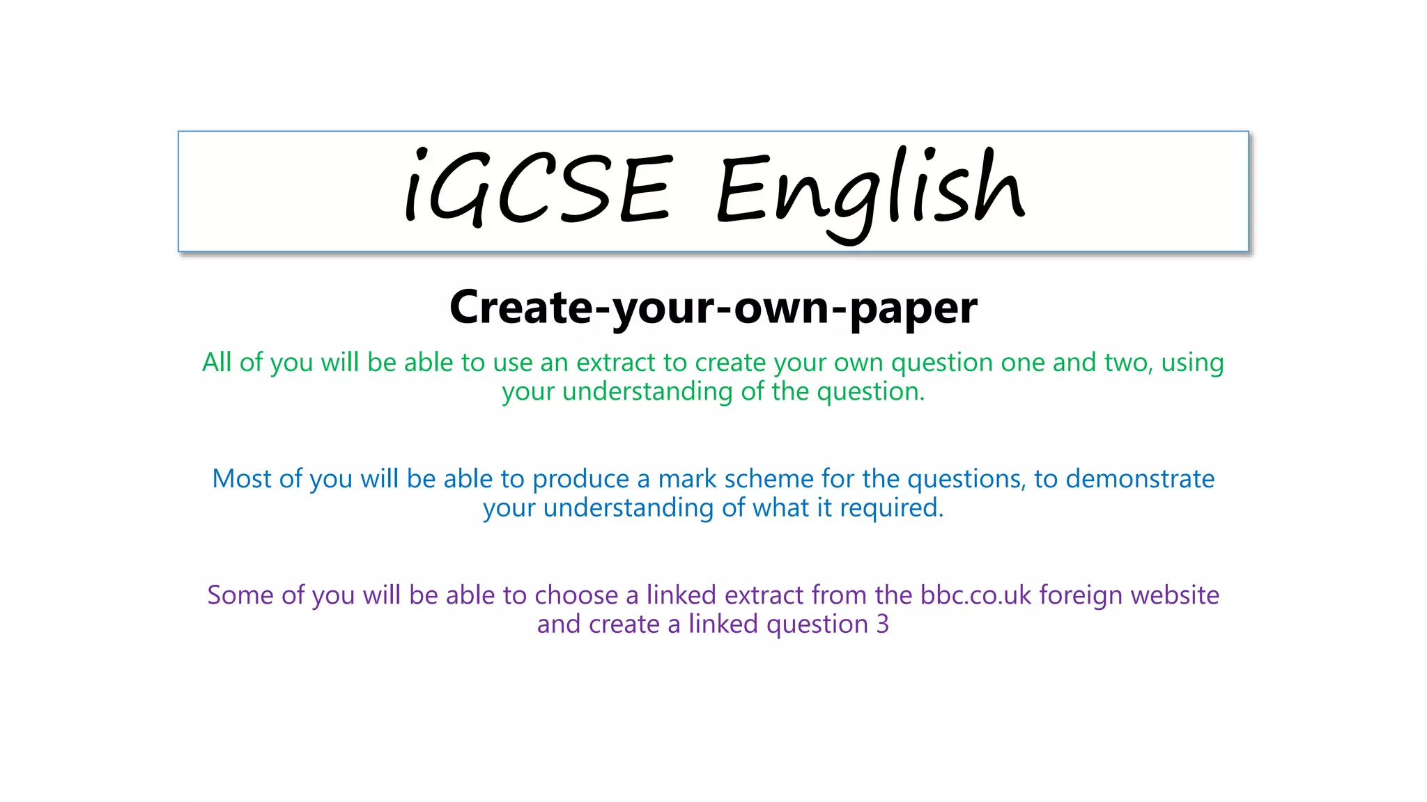 This document provides guidance and examples for students creating their own exam questions and mark schemes based on a provided text extract. It includes: