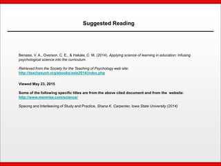The document discusses strategies for improving learning retention through applied practice over time. It proposes a method called Applied Learning Extensions (ALE) which involves generating learning activities 10 times over 90 days following training. This spaced practice through low-stakes activities like surveys and webinars is meant to reinforce learning and move it from short-term to long-term memory. The document provides examples of different types of activities that could be assigned on various days as part of an ALE program. Implementing ALE is intended to close the gap between initial recall just after training and retention of knowledge much later.