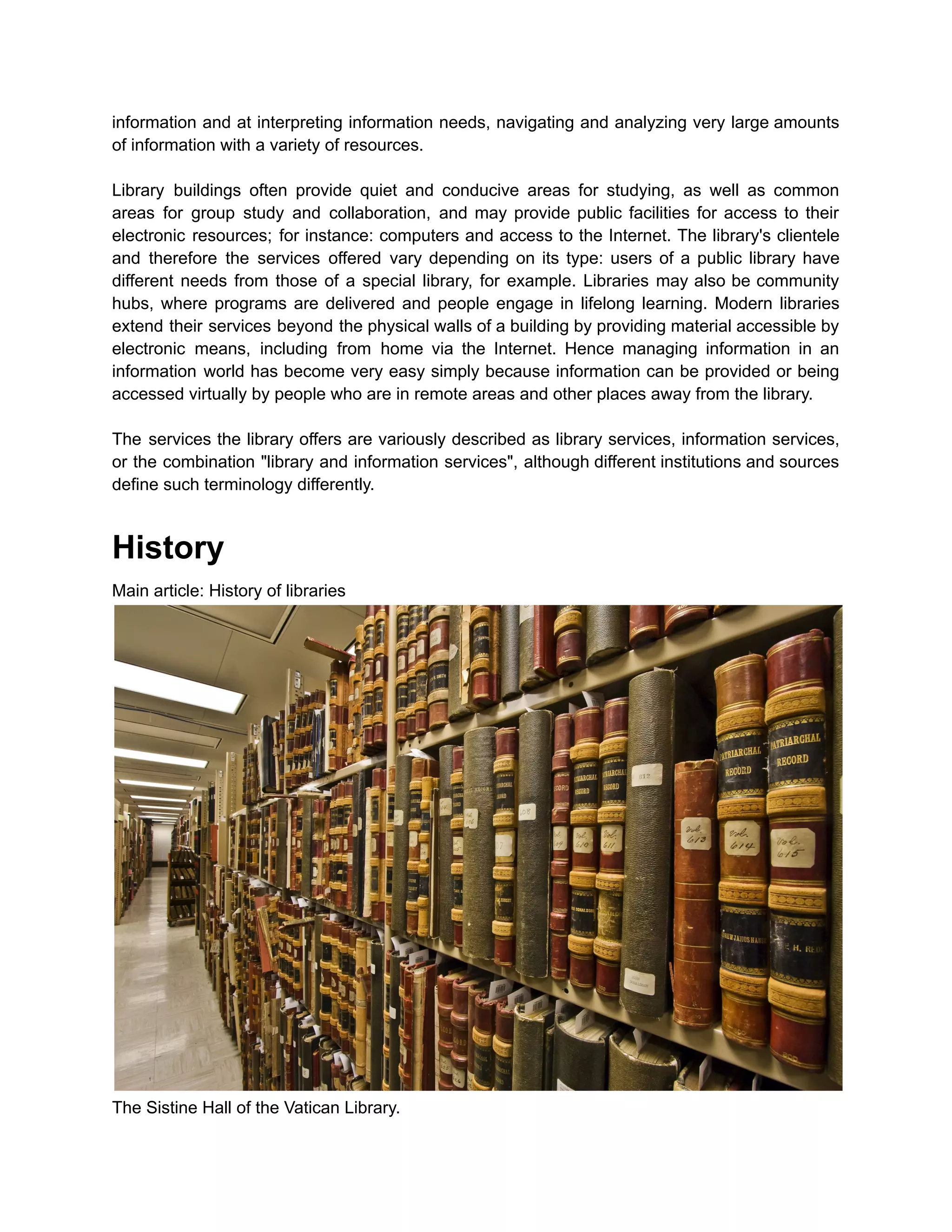 The document discusses the concept and functions of libraries, defining them as collections of accessible materials, both physical and digital, and highlighting their role in providing information and community services. It traces the history of libraries from ancient times to modern digital transformations, emphasizing their evolving role in education and research. Various types of libraries are detailed, including public, academic, reference, and research libraries, each serving distinct purposes and clientele.