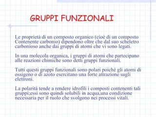 Le proprietà dei composti organici dipendono dalla loro struttura e dai gruppi funzionali, che sono polari e solubili in acqua. La documentazione esplora reazioni chimiche, distinguendo fra reazioni esasperanti ed energiche e spiegando la regolazione del pH in relazione alla crescita cellulare e all'acidificazione delle sostanze. Viene trattata anche la distinzione tra acidi e basi con riferimenti a teorie chimiche, caratteristiche e esempi nella vita quotidiana.