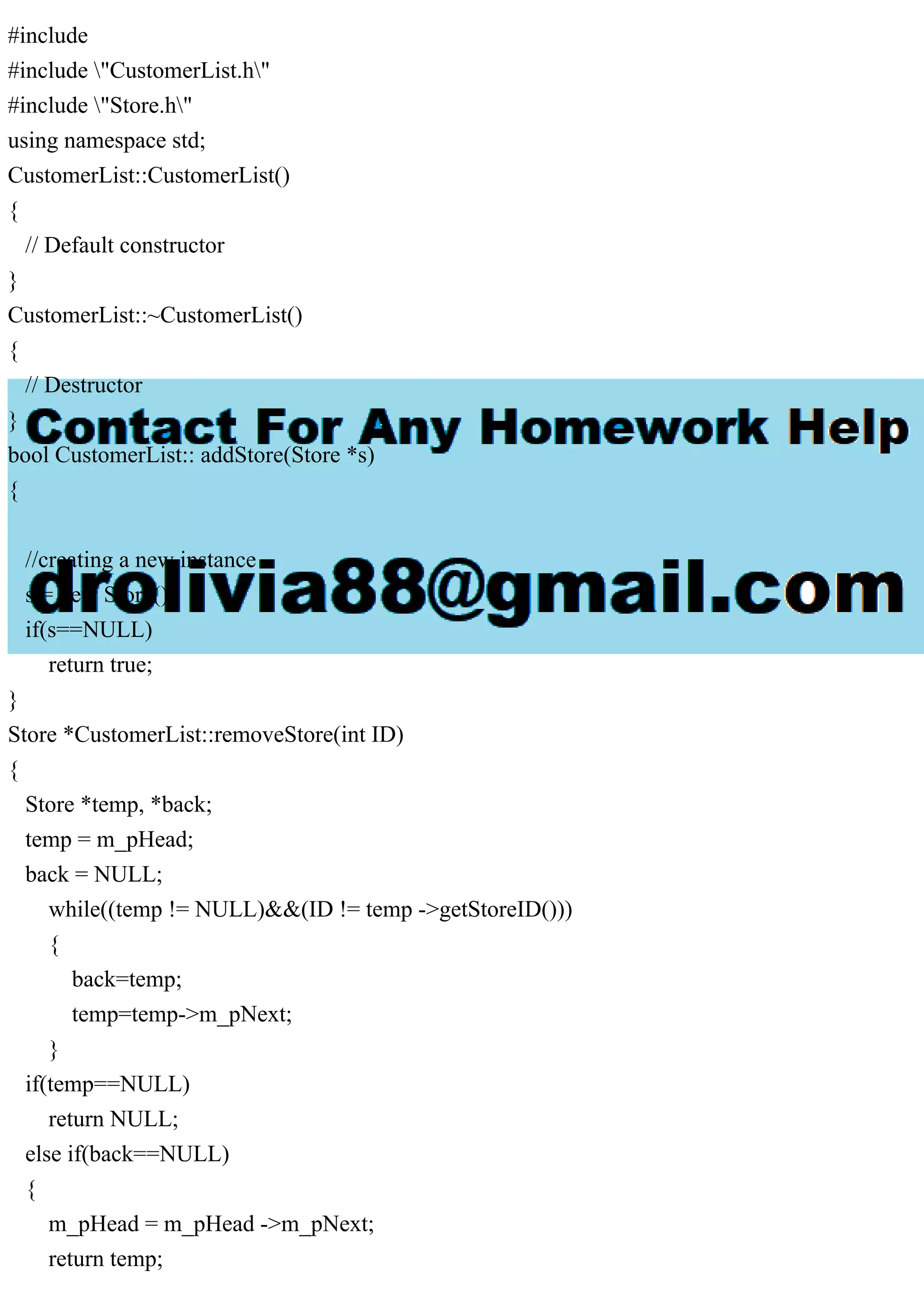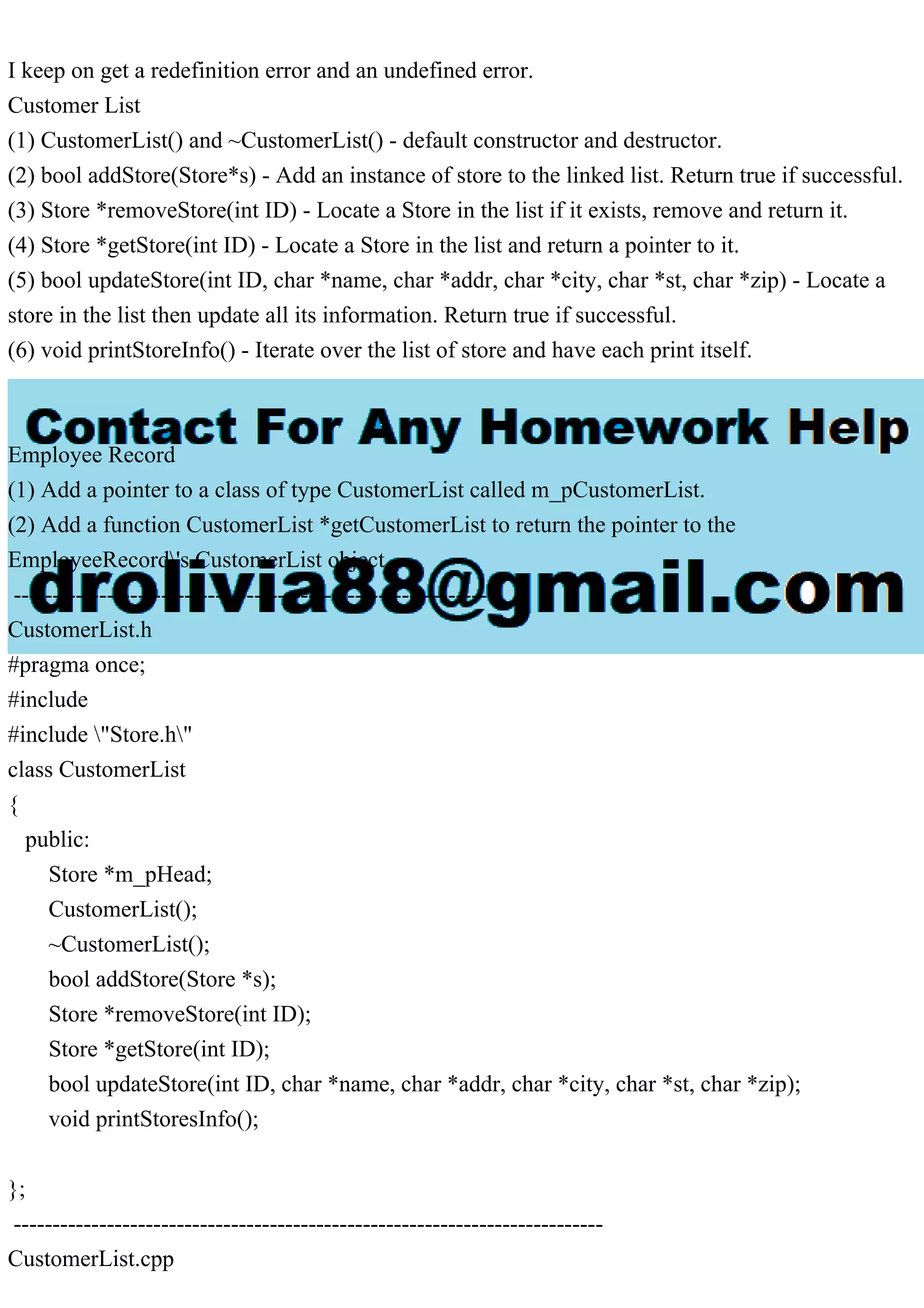 The document provides a detailed overview of the implementation of a customer list and store management system in C++. It includes class definitions, function prototypes for adding, removing, updating, and printing stores, as well as employee records functionality. It outlines specific errors encountered, such as redefinition and undefined errors, and presents relevant code snippets for each class and function involved.
