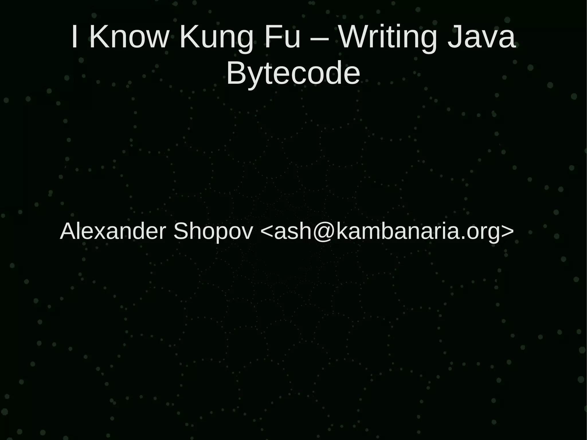 The document discusses bytecode manipulation in Java using ASM. It begins with an introduction to bytecode and ASM. It then covers classfile structure, reading and transforming bytecode with ASM visitors, and provides examples of renaming a class, adding a field, changing a method, fixing constructors, and adding an interface. The overall document serves as a tutorial for how to manipulate Java bytecode programmatically using the ASM framework.