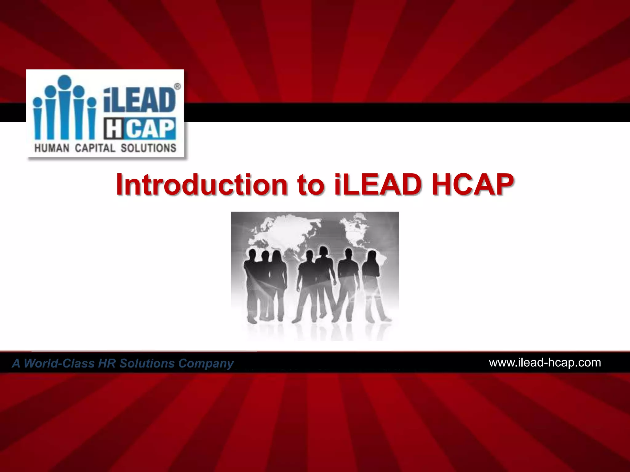 iLEAD HCAP is a full-service HR firm that offers solutions such as talent acquisition, testing and assessment, learning and development programs, HR consulting, and outsourcing processes. It has offices in several countries including the US, Southeast Asia, and the Middle East. The document provides details on iLEAD HCAP's service portfolio and solutions for recruitment, assessment, training, consulting, and outsourcing HR functions.