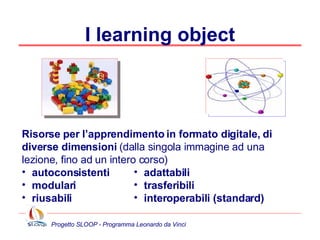 Il documento discute l'evoluzione del Web 2.0 e il concetto di learning object, risorse digitali modulari e riusabili per l'apprendimento. Viene presentato il progetto SLOOP, che promuove la creazione collaborativa di learning object e la loro gestione secondo standard interoperabili. Si sottolinea l'importanza di adattare le metodologie didattiche alle nuove tecnologie e al linguaggio digitale dei nativi digitali.