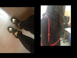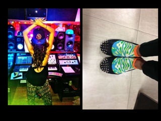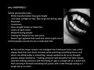The document discusses Khushboo Wadhwani's inspiration and creative process centered around horror movies and vampires, detailing personality traits associated with vampires that resonate with her. It outlines the brand's target audience, which is primarily young, literate males interested in punk and edgy fashion styles, and elaborates on feedback received regarding visuals promoting leather jackets. Lastly, it evaluates visual appeal, styling, and interaction with the product through audience feedback from a presentation at Pearl Academy.