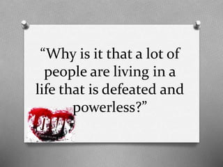The document discusses why some people live defeated lives and how understanding messages affects responses. It emphasizes that God's unconditional love is shown through Jesus, who frees people from sin and makes all things possible. God graciously gives all things through his love, which people should remain in as shown through Jesus sacrificially loving people.