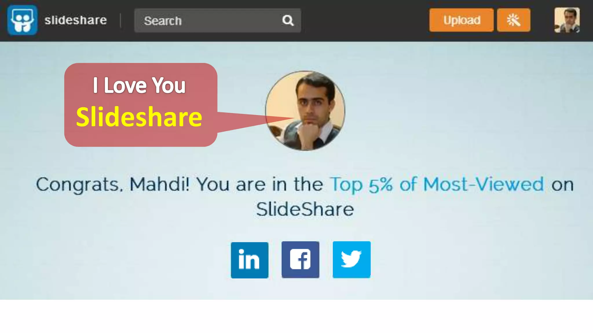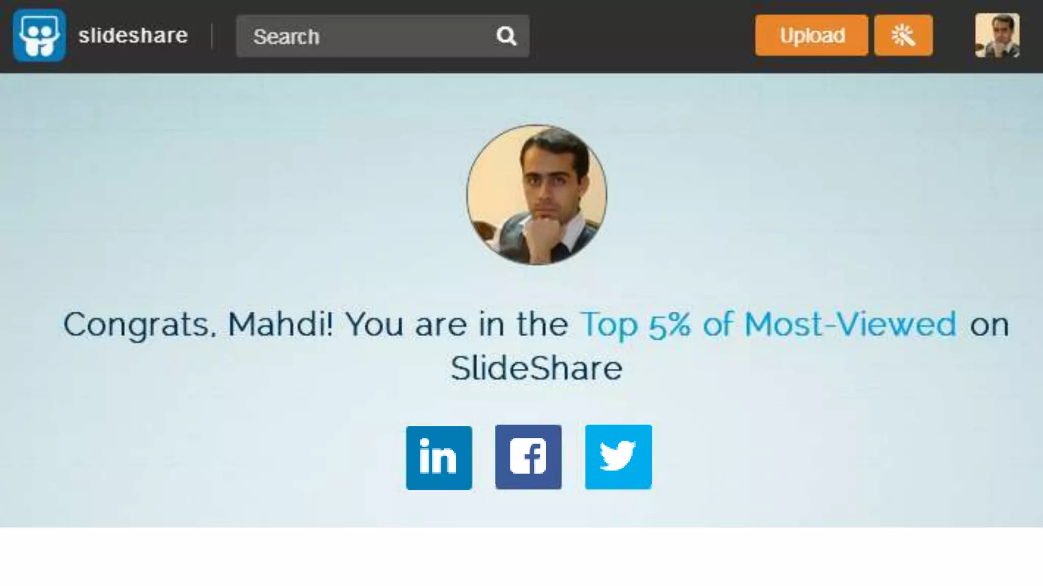 من علاقه زیادی به تولید و انتشار محتوی در اسلایدشیر دارم. اسلایدشیر هم بهم ایمیل زده و تبریک گفته که تونستم جزو پنج درصد اول پربازدیدترین اکانت ها قرار بگیرم. :) خوشحالم