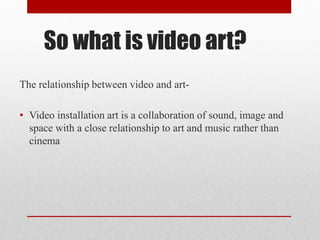 Video art challenges notions of screen, space, and realism by using technology to create visual art outside of traditional film narratives. It allows viewers to see in new ways, like Bill Viola's Emergence which uses extreme slow motion to reveal details invisible to the naked eye. This document discusses the history and goals of video art, key artists who experimented with the medium, and how viewing Viola's slow motion work influenced the creator to make their own videos exploring slow motion effects.