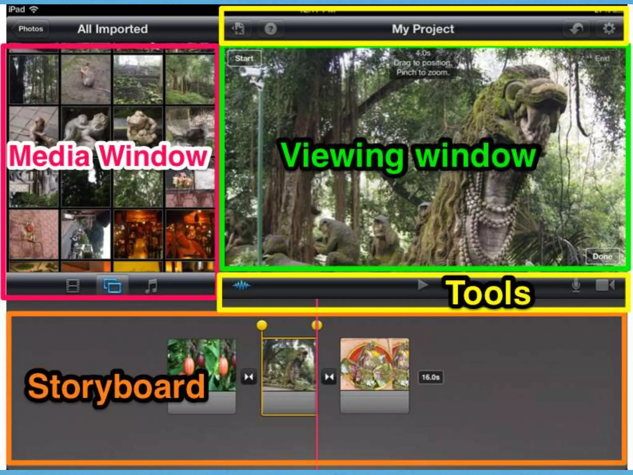 This document provides instructions for creating videos using the iMovie app for iPad. It outlines the basic workflow which includes: 1) adding images and video clips, 2) recording audio narration, 3) adjusting the timing of clips to match the audio, 4) making additional adjustments like adding transitions and background music, 5) adding a theme and text titles. It then provides step-by-step instructions for how to complete each part of the process within the iMovie interface on iPad.