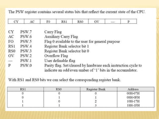 The document describes the architecture and components of an 8051 microcontroller. It includes details about the CPU registers like the accumulator, program status word, stack pointer, and timers. It describes the ports, interrupts, and memory organization. The special function registers control functions like timers, serial communication, and interrupts. The timers can be configured in different modes to generate time delays or count events. External memory can be accessed using address and data lines connected to the ports.