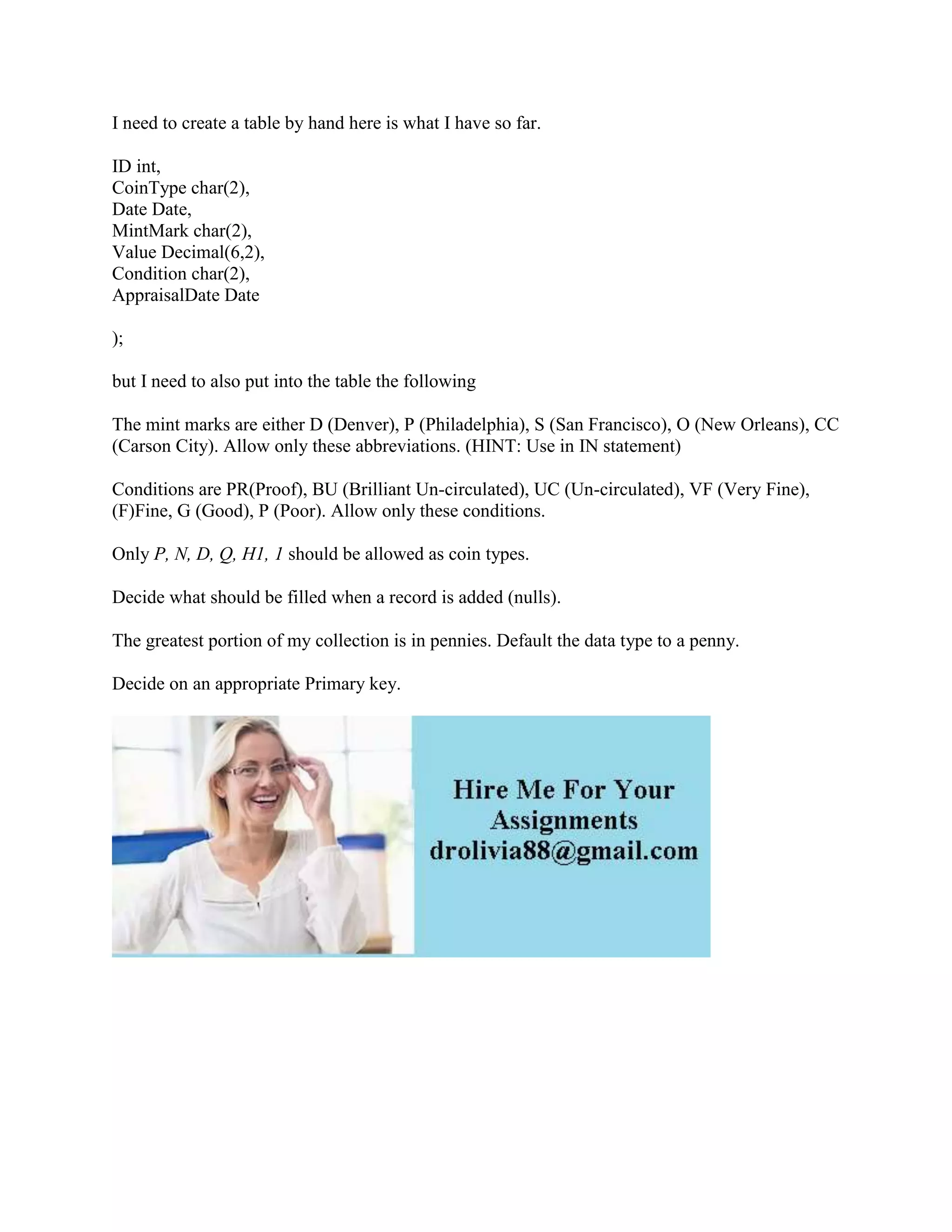 The document outlines the design requirements for a coin collection table, specifying the necessary fields such as ID, coin type, date, mint mark, value, condition, and appraisal date. It defines acceptable values for mint marks, conditions, and coin types, while suggesting the use of defaults and nulls where appropriate. The greatest share of the collection consists of pennies, and the document also mentions the need for a suitable primary key.