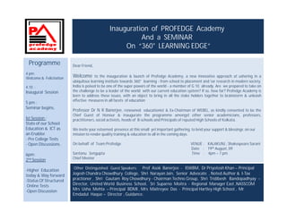 The document announces the inauguration of Profedge Academy, a new innovative learning institute aimed at providing 360-degree learning from school to career placement or research. The academy was launched to address issues with India's current education system and whether it adequately prepares students to help India become a global leader. Distinguished guests including education experts and school principals were invited to the inauguration event to lend their support. The event included sessions on improving school education through technology, the state of higher education, and using structured online tests.