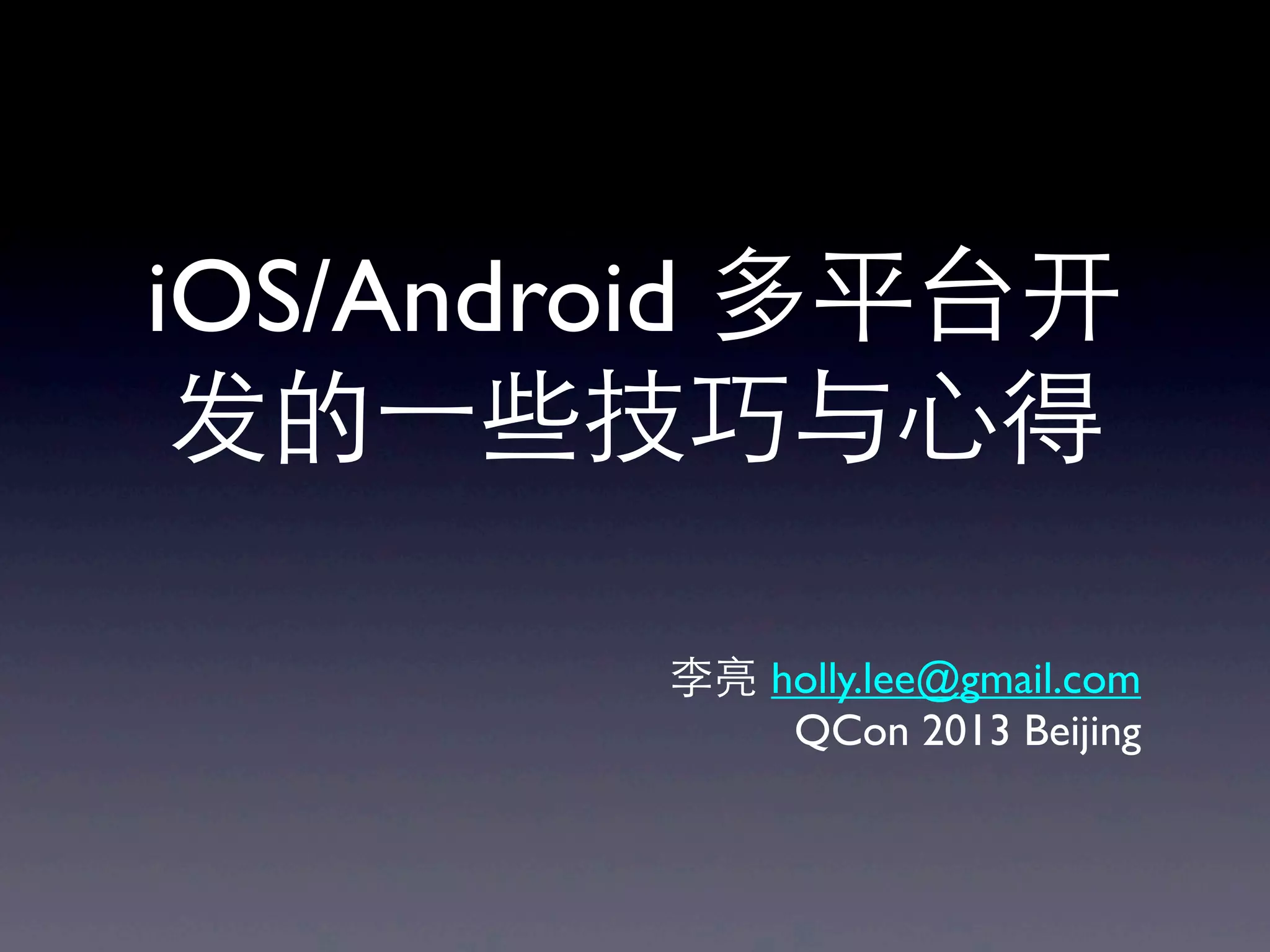 本文探讨了多平台(iOS/Android)开发中的代码和界面设计重用的技巧与经验。强调了代码重用的重要性和挑战,包括不同平台语言及设计风格的差异,并介绍了一些跨平台开发工具的优缺点。最后,文中还讨论了Web应用的优势和劣势。