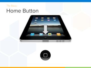 This document provides instructions for basic iPad functions including using the home button, switching between apps, adjusting volume, searching, zooming, taking screenshots, copying/pasting text, connecting to WiFi, creating folders, docking apps, force closing apps, and setting a passcode lock. Key functions covered are the home button, app switching, volume control, search, zoom, screenshots, symbols, copy/paste, WiFi settings, creating folders, docking apps, force closing apps, and passcode locking.