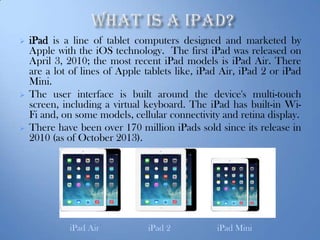 The iPad is a line of tablet computers designed by Apple that runs the iOS operating system. There are several models of the iPad including the iPad Air, iPad 2, and iPad Mini. Over 170 million iPads have been sold since its release in 2010. All iPads have features like a multi-touch screen, WiFi, and battery life of around 10 hours, and can be used to take photos, access the internet, play games and music, and more through downloaded apps from the App Store.