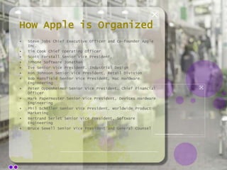 The document provides information about Apple's new product, the iPad tablet computer. It discusses Apple's organizational structure and leadership under Steve Jobs. It also outlines the history of Apple's attempts to create a tablet dating back to the 1990s. The document discusses the opportunity for iPad in the market as well as key publics and stakeholders. It analyzes human factors considerations, ethical issues regarding Apple's use of the name "iPad," and provides a timeline of events and citations.