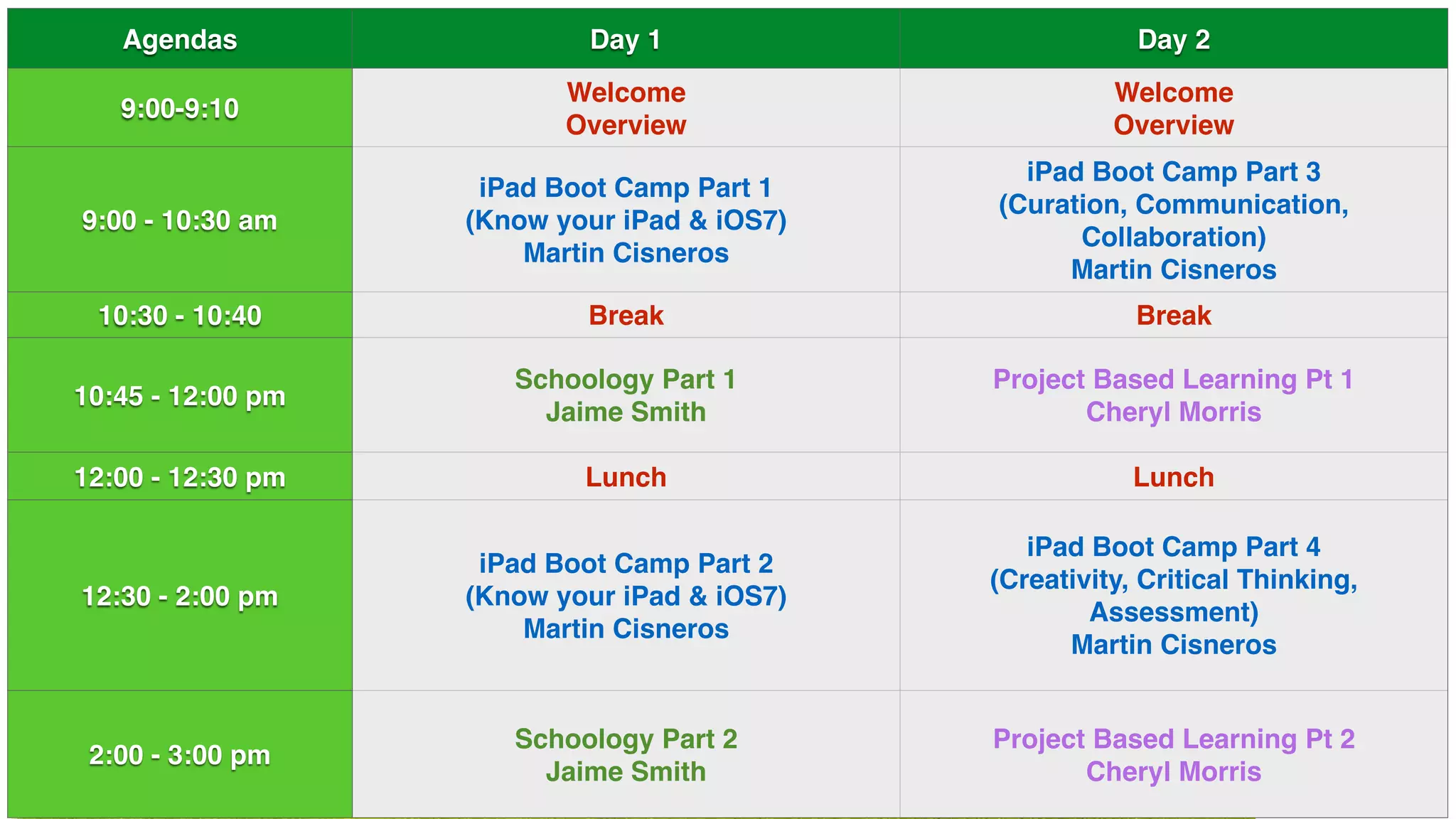 This document contains schedules and information for a two-day iPad Academy hosted by TheTechProfe.com. Day 1 includes sessions on iPad basics, the Schoology app, and project-based learning. Day 2 focuses on more advanced iPad topics like curation, communication, collaboration, creativity, critical thinking and assessment. Additional documents provide details on topics like the home screen, settings, apps, and troubleshooting.