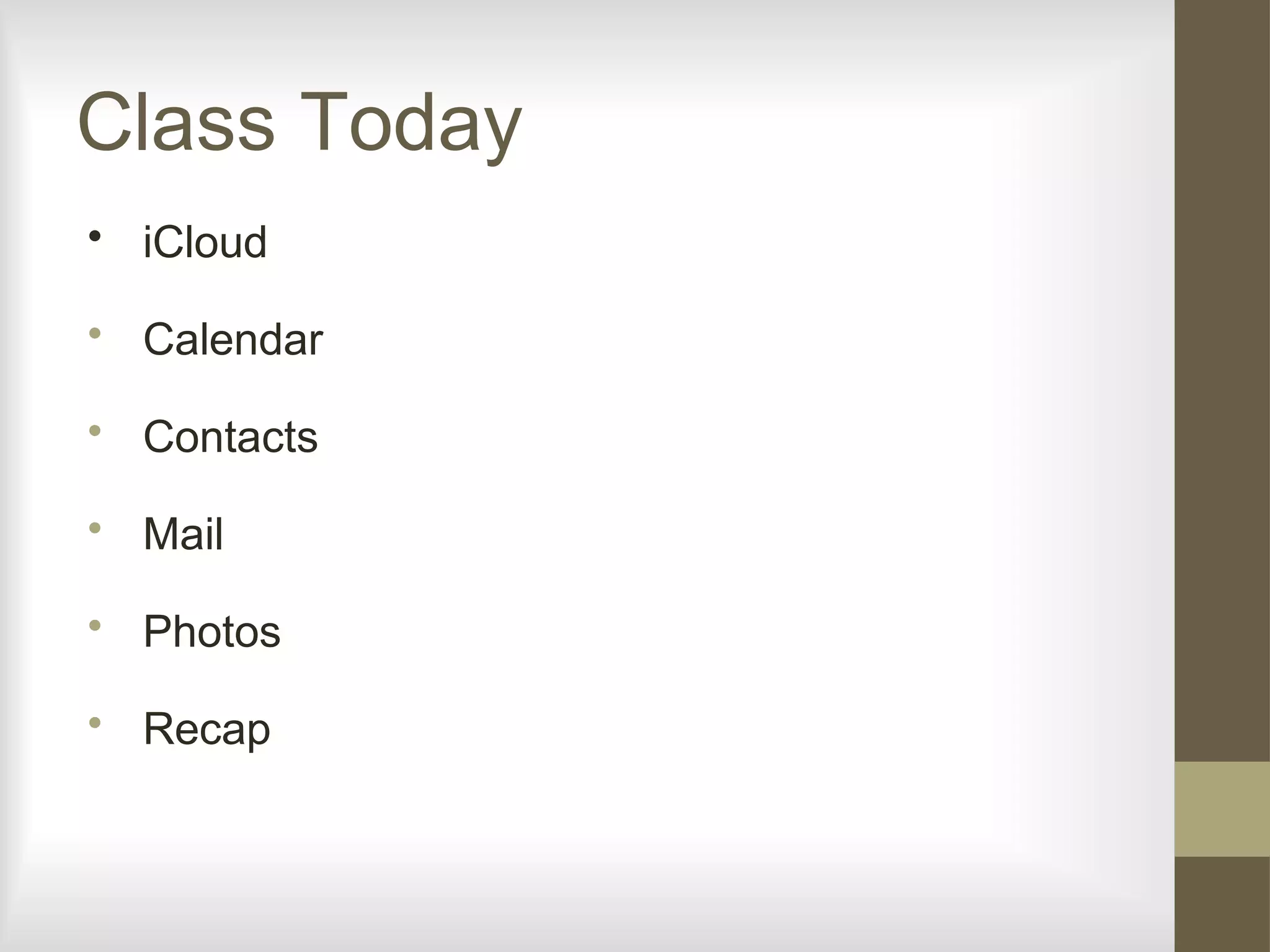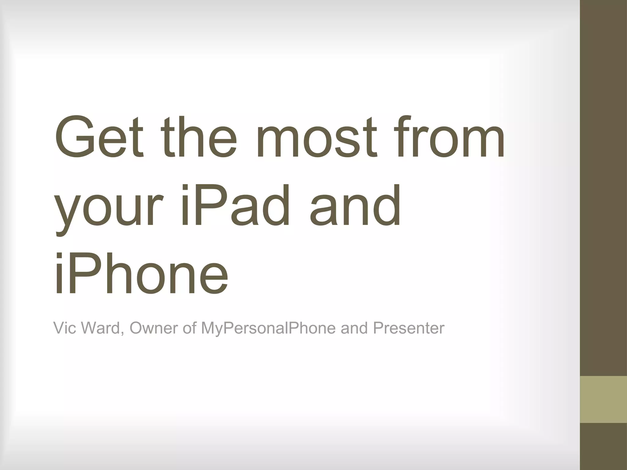 This document provides an overview of iCloud features and how to set them up on iOS devices. It discusses using iCloud to backup and restore devices, share photos, keep calendars and contacts synced, and find lost devices. The instructor Vic Ward reviews iCloud, Calendar, Contacts, Mail, Photos, and how to access help pages for setting up these features. Users are instructed to set up an @icloud.com email if needed to use iCloud services fully.