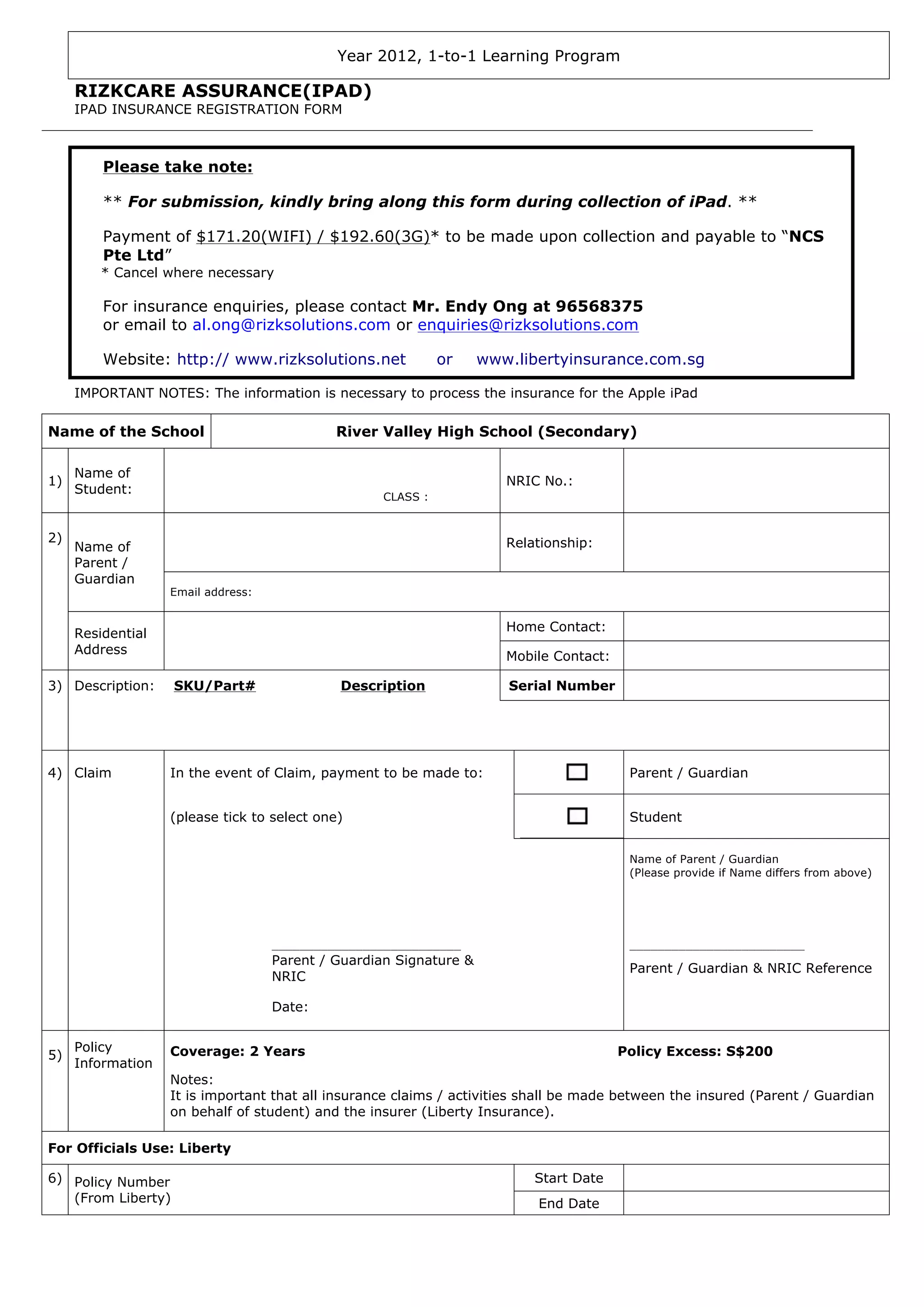 2) It requires basic student and parent/guardian contact information as well as the iPad serial number to process the insurance through RIZKCARE ASSURANCE and Liberty Insurance.