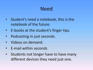 The document discusses the iPad and its capabilities as a replacement for multiple devices. It can be used as an e-book reader, to watch videos, listen to music, browse the web, take notes, and stay organized with a calendar and contacts. Early research is being done to see if the iPad is better than other tablets and e-readers, and if it can be incorporated into academic settings. While the iPad is currently unique, other companies are working on their own tablet devices, and it remains to be seen if the iPad will replace personal computers.