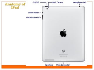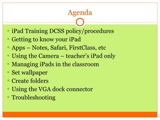 The document provides an overview of iPad training for teachers in the DeKalb County School System. It discusses DCSS policy around iPad usage, including restrictions on student access to apps and cameras. It also outlines how to manage iPads in the classroom, set wallpapers, create folders, and use the VGA adapter. Troubleshooting tips and recommended apps are mentioned. The iPads will be centrally managed through a mobile device management system to control device settings and restrictions.