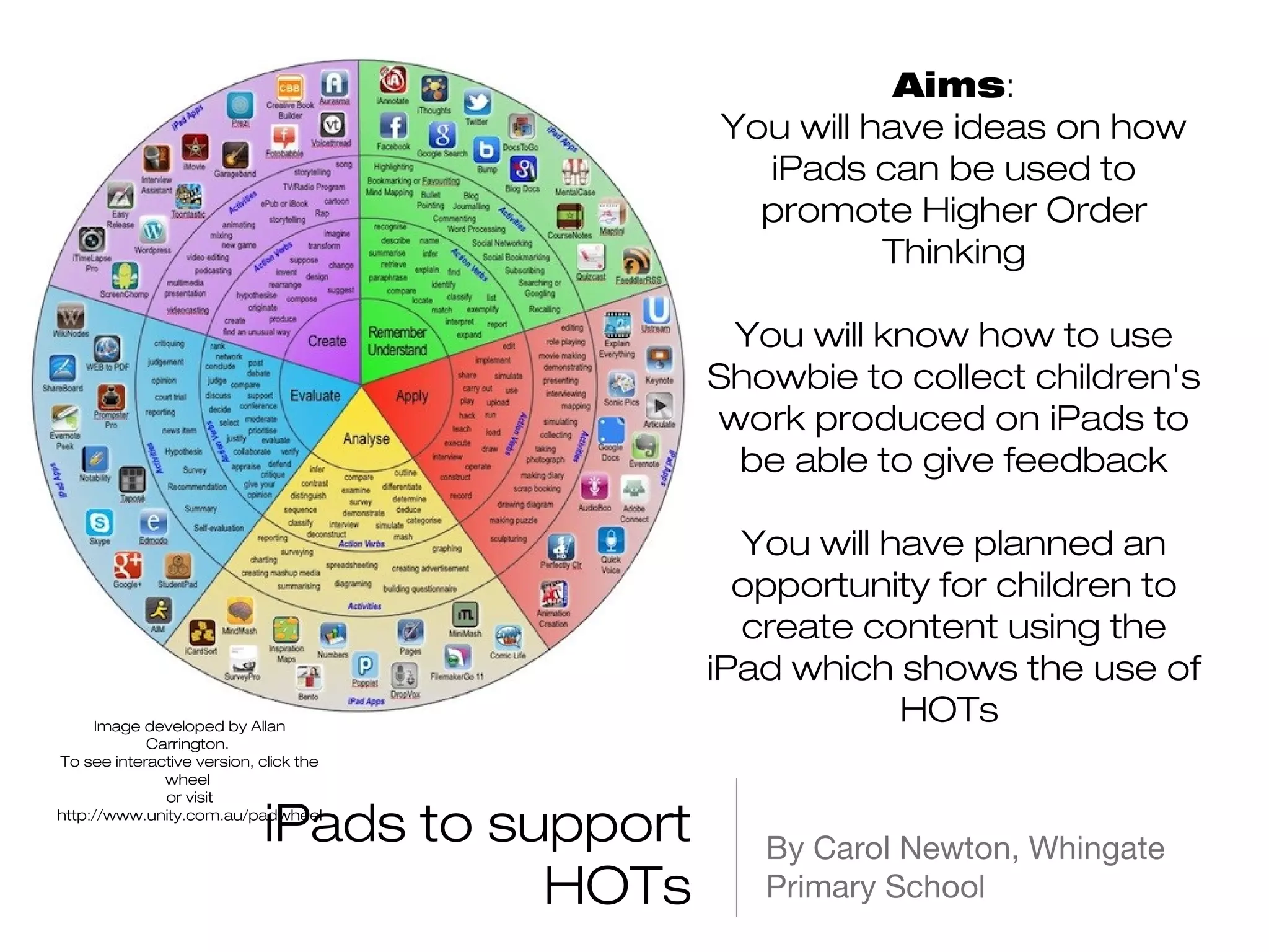 This document provides examples of how iPads can be used to promote higher order thinking skills (HOTs) in topics work and reading. It describes how apps like Popplet, Educreations, PicCollage, and Smoovie can be used for tasks involving understanding, applying, analyzing, evaluating, and creating. Teachers are asked to plan an activity using one of the apps that enhances learning in an upcoming unit and to link it to an aspect of Bloom's Taxonomy. Instructions are also provided on setting up Showbie accounts and using the app to collect and provide feedback on student work.
