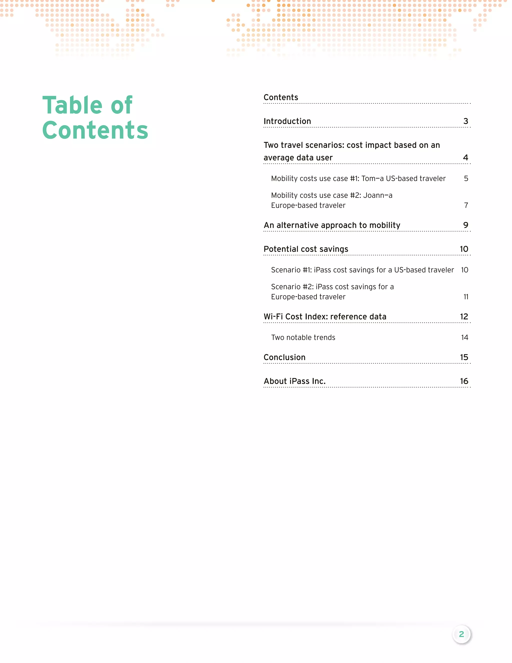 The iPass Wi-Fi Cost Index report details the complexities and costs associated with mobile connectivity for business travelers. It explores mobility costs through two use cases: a US-based traveler and a Europe-based traveler, highlighting their varying usage of Wi-Fi and 3G/4G services during international trips. Ultimately, the report emphasizes the necessity for organizations to understand these costs for improved budgeting and productivity management.