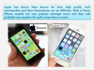 The document compares the iPhone 5s and iPhone 5c, highlighting their similarities and minor differences in specifications such as weight, battery capacity, and processor. Both models are praised for their high quality and user-friendliness. Additionally, contact information for iPhone parts is provided.