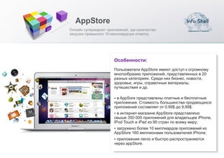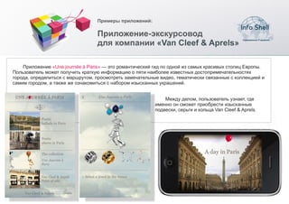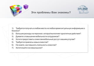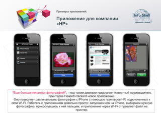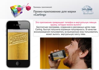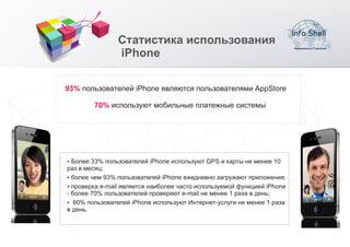 Документ предлагает решения для бизнеса, ориентированного на мобильные технологии, подчеркивая их важность в условиях растущей мобильной коммерции. Указывается на целевую аудиторию пользователей iPhone как на обеспеченных людей среднего возраста. Приведен пример рекламного приложения Coca-Cola, которое отвечает на вопросы пользователей через взаимодействие с мобильным устройством.